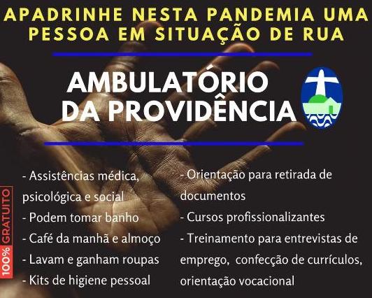 Em tempos de coronavírus, o Ambulatório da Providência está preocupado com as pessoas em situação de rua. Por isso, ele abriu a campanha “Apadrinhe nesta pandemia uma pessoa em situação de rua”, doando roupas, material de higiene, alimentos, e ajudando também em orientações jurídicas, cursos profissionalizantes e muito mais. Para mais informações é só acessar…