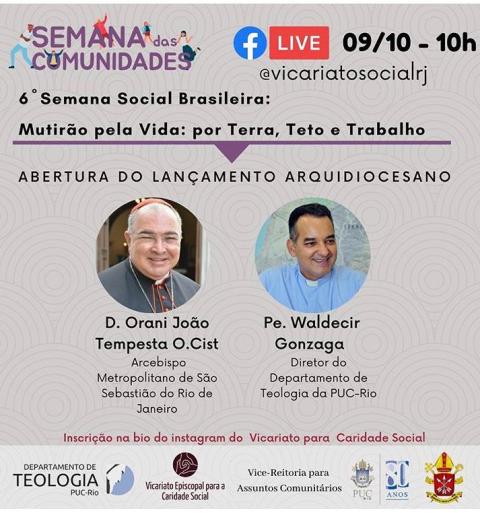 Nesta sexta-feira, às 22 horas, o encontro entre o Arcebispo do Rio de Janeiro, Cardeal Orani João Tempesta e o padre Marcus Vinicius que irão abordar a nova encíclica do Papa Francisco “Fratelli Tutti. A mediação será da jornalista Daniela Oliveira. Transmissão pela Rede Vida, Rádio Catedral, e facebook da WebtvRedentor.