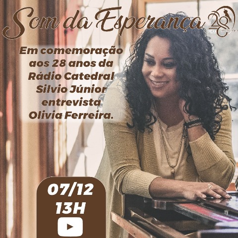 Não perca, nesta segunda-feira, 7 de dezembro, o locutor Silvio Junior irá fazer uma live com a cantora Olivia Ferreira, às 13h, no Som da Esperança. A live abre as comemorações dos 28 anos da Rádio Catedral. Você pode acompanhar pela Catedral-FM, 106,7 ou na nossa página no facebook.