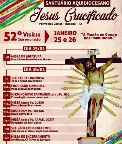 O Santuário Jesus Crucificado, que fica em Porto das Caixas, em Itaboraí, Niterói, vai comemorar neste fim de semana a festa de seu padroeiro. A missa de abertura será no sábado, dia 25, às 19h, e no domingo, dia 26, a programação terá início às 3h, com uma Via Sacra Luminosa, com a juventude, em…