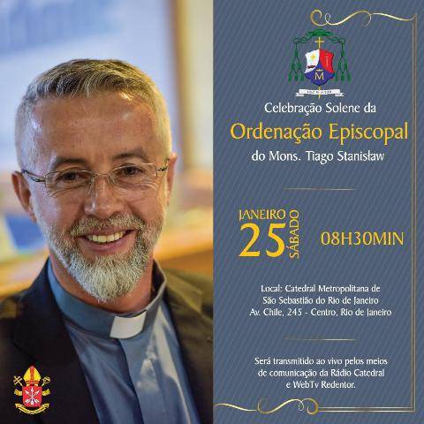 Toda comunidade do Rio de Janeiro é convidada para comparecer neste sábado, dia 25, na Catedral de São Sebastião, para a missa de ordenação episcopal do monsenhor Tiago Stanislaw. A celebração terá início às 8h30.