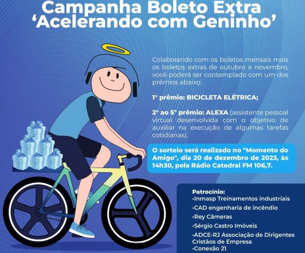 CAMPANHA BOLETO’🚵 Acerando com Geninho 🚵♀️ Colaborando com os boletos mensais mais os extras de outubro e novembro, você poderá ser contemplado com um dos prêmios abaixo: 1° prêmio | Bicicleta Elétrica2° ao 5° prêmio | Alexa – assistente pessoal virtual desenvolvida com o objetivo de auxiliar na execução de algumas tarefas cotidianas. O sorteio…