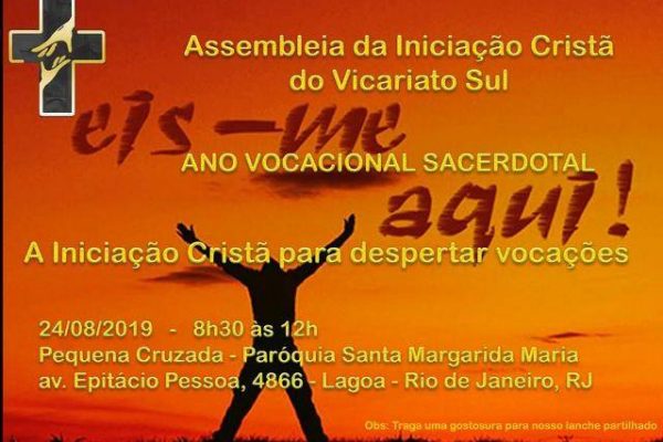 Os coroinhas e cerimoniários das paróquias e capelas do Vicariato Sul estão sendo convocados para um encontro no dia 28 de setembro. O encontro vai ser na Basílica Imaculada Conceição, na Praia de Botafogo, 266, das 8h30 às 15h. Vai ter formação, espiritualidade, lazer e a santa missa. Não é preciso fazer inscrição.