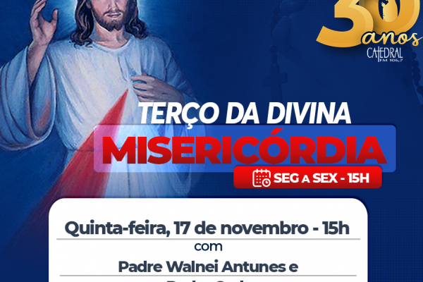 Padre Walney Antunes vai conduzir o Terço da Misericórdia hoje, pelas onda da Rádio Catedral. Acompanhe conosco o terço, às 15h, pela nossa rádio, FM 106,7, ou nas nossas mídias sociais. Para fazer o seu oferecimento e pedido de oração é só acessar a central de relacionamento da Catedral-FM, 3231-3560.