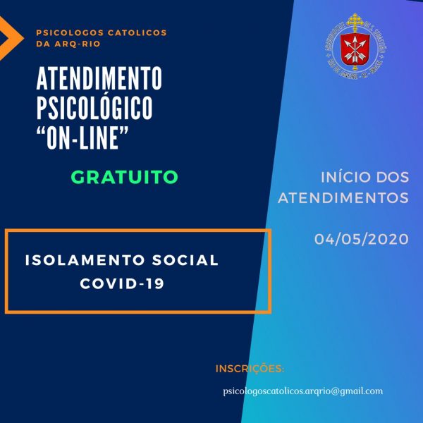 Em tempos de isolamento pelo coronavírus, os Psicólogos Católicos do Rio de Janeiro vão começar a fazer atendimentos on-line gratuito. O início será na próxima segunda-feira, 4 de maio. Para receber o atendimento, você deve se inscrever pelo email psicologos católicos.arqrio@gmail.com.