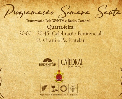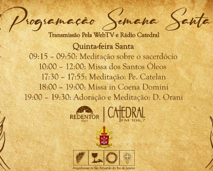 Nesta quinta-feira terá início o Tríduo Pascal, e nesses tempos de quarentena, a Rádio Catedral e WebTV Redentor levará à sua casa uma programação toda especial, para que você possa participar das celebrações: 9h15 – Meditação sobre o sacerdócio 10h – Missa dos Santos Óleos 17h30 – Meditação com o Padre Catelan 18h – Missa…
