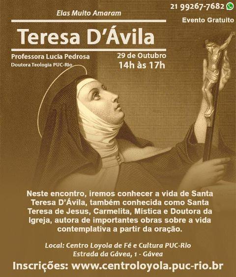 A vida de Santa Teresa D’Ávila será contada no dia 29 de outubro pela professora Lucia Pedrosa, doutora em teologia da Puc. A palestra vai ser no Centro Loyola de Fé e Cultura, na Gávea, das 14h às 17h. As inscrições estão abertas no site www.centroloyola.puc-rio.br